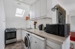Spacious reception room with storage cupboards, clever pull-down bed system, air conditioning and semi open plan kitchen with clever use of Velux skylights throughout.